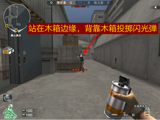如上图所示,我们可以在A小道木箱位置投掷这颗瞬爆闪,身体站在木箱边缘,背靠木箱准备投掷。