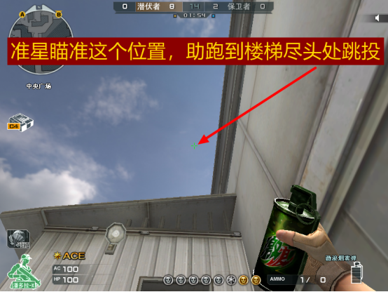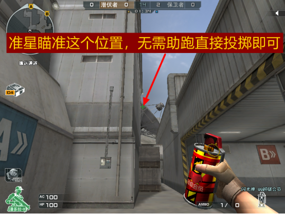 如上图所示,作为潜伏者的我们可以在中路狙楼楼梯位置投掷这颗烟雾弹,利用狙楼楼梯进行助跑投掷即可。