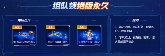组队领绝版永久!CFer们在活动期间加入组团,完成任务,积累积分,即可领取奖励!同时不玩游戏,看直播,赛事,掌火也都能领取积分哦~