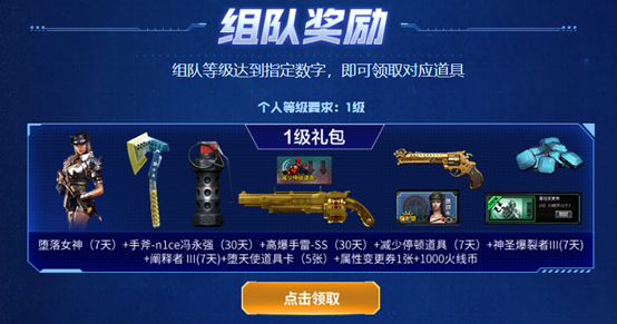 组队奖励!CFer们在活动期间组队等级达到指定数字,即可领取对应道具哦~1级礼包道具直接任性领!