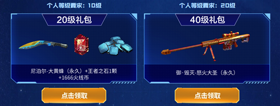 20级礼包(个人等级需求:10级)直接领取尼泊尔-大黄蜂(永久)+王者之石1颗+1666火线币;40级礼包(个人等级需求:20级)终极奖励领取绝版永久御·毁灭-怒火大圣!