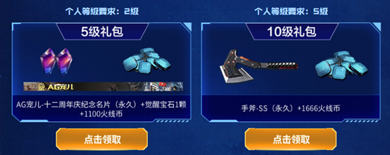 随着团队等级的提升,获得的道具奖励也将越豪华!5级礼包(个人等级需求:2级)直接可领取AG宠儿-十二周年庆纪念名片(永久)+觉醒宝石1颗+1100火线币;10级礼包(个人等级需求:5级)直接可领取手斧-SS(永久)+1666火线币!