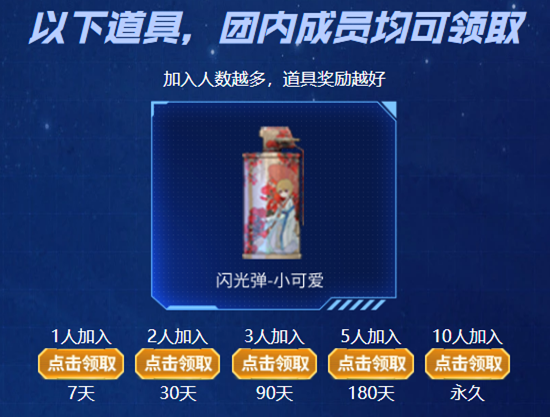组团领闪光弹-小可爱!CFer们在活动期间组建的团队人数越多,领取的道具奖励也将越豪华~团队累计10人加入,即可直接领取闪光弹-小可爱(永久)啦!