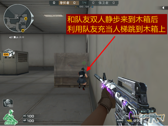如上图所示,我们可以和一名队友静步摸到A小道白房木箱后,这里一定要保持全程静步,避免让铁箱后的保卫者听到我们已经进入白房。让队友蹲在木箱后充当人梯,我们利用队友跳到木箱上,不露一点脚步声成功跳到木箱上。