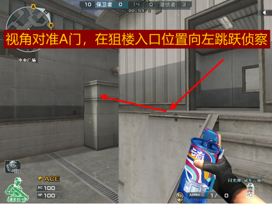 如上图所示,我们可以在中路狙楼位置利用地形优势进行侦察探点。在狙楼上进行跳跃探点,我们可以在空中通过A门非常清晰地看到A包点敌人的站位,为我们接下来的战术做准备。
