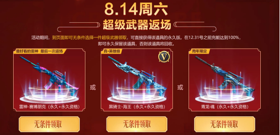 CF辅助热情永不变,叨叨天天见!各位火线老哥们,我们的叨叨又和大家见面了!8.14官方将开启8月第二周的超级活动,其中来到页面可无条件直接在永久+永久资格的三把武器中任选其一领取。