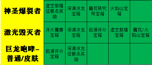 伪装-试炼祭坛;黎明玫瑰-破碎之都,深海巨钳-曙光战舰;无畏之矛,斯沃特无畏-无畏战舰;不灭之拳,冰火神拳,冰火魔兽-冰火遗迹;海斯博士双刃(含激光皮肤),克罗诺斯的凝视-巨人城起源。泰坦之拳-新巨人城废墟。