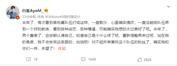 要说白老板为何能够如此伤心,那大概就是他的付出和回报不成正比吧。了解他的CFer们都知道,白老板无论对待任何事物都是非常认真、拼劲十足的,这一点说的通俗易懂一点儿就是上头。他对待自己的队伍也是十分尽心尽力的,无论是赛后总结又或者是队伍训练,白老板都亲力亲为。这也使得队伍成绩不佳导致了自己的情绪崩盘,付出这么多到头来还是一场空。不光白老板本人,所有的白鲨粉丝和白老板一样难受。因为反观白鲨今天的表现,确实不尽人意。战术被拿捏的死死的、临场的东西也准备的不多,与常规赛相比起来并没有太多新奇的战术,最令人意想不到的是白鲨被零封。